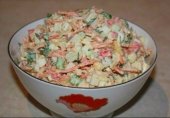 Состав:· филе курицы· 6-7 крабовых палочек ( можно крабовое мясо )· 2-3 яйца· 1/2 большого красного болгарского перца· помидор· соль· белый перец· майонезПриготовление:Отварить филе курицы, остудить.