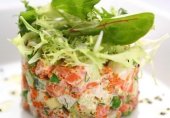 Ингредиенты:— 300 г свежей слабосоленой семги,— 5 картофелин,— 3 яйца,— 1 маринованный огурец,— 2 свежих огурца,— 0,5 баночки зеленого горошка,— укроп,— 1 луковица,— 100 г красной икры (или икры сельди),— сметана нежирная,— руккола,— соль и перец.
