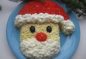 Еще один салат для новогоднего стола в форме головы Деда Мороза. Ингредиенты - крабовые палочки, яблоко, яйца, лук и сыр, оформление - яичные желтки и белки, красный перец и оливки.