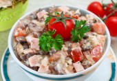 Многослойный салат с копченым куриным филе, тертым сыром, яйцом, черносливом, грибами и орехами.