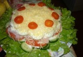 Многослойный салат-тортик из консервированных ананасов, вареных яиц, тертого сыра и креветок. Не забывайте каждый слой, кроме верхнего, смазывать майонезом.