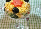 Креветки, кальмары, крабовые палочки - всё смешалось в этом салате специально для любителя морепродуктов.
