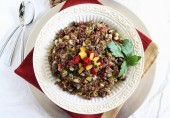 Оригинальный салат из киноа с овощами и салями, пикантность которому придает заправка на основе уксуса и меда.