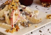 Салат из свежих яблок с орехами, медом и изюмом, заправленный йогуртом и сметаной.