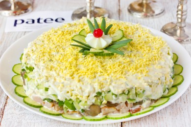 Этот салат в виде грибочка имеет не только оригинальный внешний вид! Он оформлен слоями, поэтому получается очень нежным, воздушным, а также благодаря большому количеству ингредиентов ещё и сытным и питательным!