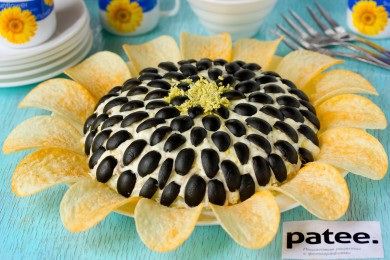 Готовим вкусный салат Подсолнух с грибами в оригинальном оформлении! Казалось бы, обычные ингредиенты: отварное куриное мясо, картофель, яйца, лук и обжаренные шампиньоны, но благодаря креативной подаче салат подсолнух становится похожим на цветок подсолнуха!