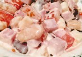 Готовим яркий и праздничный салат с фасолью и ветчиной! Яркости ему придадут сухарики, присыпанные паприкой.