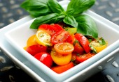 Простой салат из помидорок черри с листьями базилика, заправленный оливковым маслом с уксусом, чесноком и эстрагоном.