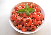 Салат из свежего охлажденного арбуза с соком лайма, оливковым маслом и листьями мяты, посыпанный сыром фета.