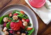 Салат из обжаренного на гриле куриного филе со свежей зеленью, клубникой, моцареллой и засахаренным пеканом, заправленный бальзамическим соусом.