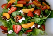 Вкуснейший красочный салат из свежей клубники с абрикосами, пеканом, салатной зеленью и козьим сыром, заправленный оливковым маслом с бальзамическим уксусом.