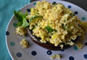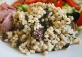 Салат из ячменя с вялеными помидорами, черными оливками, козьим сыром и сушеной зеленью, заправленный лимонным соком.