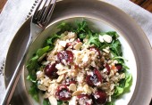 Салат из киноа со свежей вишней, заправленный оливковым маслом с винным уксусом, горчицей и сиропом и выложенный на листья рукколы.
