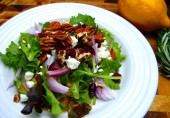 Салат из зелени с жареным пеканом, козьим сыром, луком и сушеной клюквой, заправленный соусом из малинового джема с уксусом и оливковым маслом.