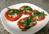 Помидоры, посыпанные смесью сыра с чесноком, сухарями и зеленью и залеченные в духовке.