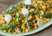 Салат из обжаренной на гриле кукурузы с бланшированной спаржей, листьями базилика и моцареллой, заправленный бальзамическим уксусом с оливковым маслом.