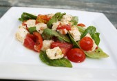 Салат из помидоров с огурцами, оливками, латуком, сыром фета и жареными креветками, заправленный оливковым маслом с лимонным соком и чесноком.
