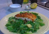 Классический салат Цезарь с жареным филе лосося, латуком, пармезаном и сухарями, заправленный лимонным соком с вустерским соусом, оливковым маслом, горчицей и чесноком.
