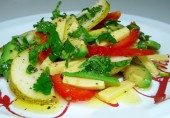 Летний салат из авокадо, груши, сладкого перца и сыра, заправленный чесночным соусом с зеленью.