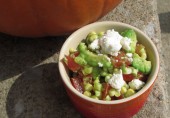 Хрустящий бекон, фасоль, зеленый горошек, кукуруза и овощи, приправленные базиликовым соусом.