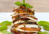 Многослойный салат Капрезе с персиками, сыром моцарелла и листьями базилика, политый бальзамическим соусом с базиликом и оливковым маслом.