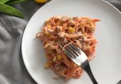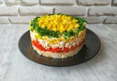 Слоеный салат "Афродита"интересен тем, что слои в нем смешиваясь, создают удивительно приятное вкусовое сочетание.