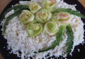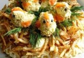 Салат в виде гнезда очень часто можно встретить на праздничном столе. Такой салат имеет вид птичьего гнезда, в классическом варианте "свитого" из жареной картошки, в котором лежат "яйца", сделанные из определенных продуктов.
