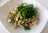 Салат получается довольно сытным благодаря наличию в нём куриной грудки и ароматным, благодаря приятному сочетанию ароматов свежего укропа, жаренного лука и измельченного чеснока.