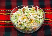 Салат Цезарь с курицей и горчично-майонезной заправкой - одна из вариаций популярного салата. Основа салата остается прежней - листья айсберга, курица, сухарики, мелкие сладкие помидоры, пармезан.