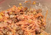 Пикантный и сытный салат. Сочетание копченой курицы, корейской моркови и кукурузы не оставит равнодушным ни одного гурмана.