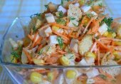 Сочетание куриного мяса и крабовых палочек может некоторым показаться слегка неуместным, но поверьте- птица и морепродукты отлично друг с другом «ладят», и если вы в этом ещё не убедились, то обязательно попробуйте салат с курным мясом, крабовыми палочками, свежим огурцом, зёрнами кукурузы и яйцами!