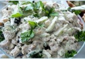 Вкусный салат из вареной курицы с орехами, зеленью, чесноком и черносливом. Выложите в салатницу или на блюдо, украсьте по своему вкусу и подавайте!