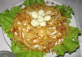 Салат с вареной курицей, яйцами, ветчиной, маринованными грибами и майонезом, с выложенным сверху жареным картофелем и яичками из сыра с зеленью и чесноком.