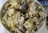 Многослойный салат из отварного куриного филе (желательно окорочка), жареных грибов с луком, ветчины, яиц и маринованных огурцов.