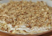 Многослойный салат из отварного куриного филе, моркови, сыра и рубленых грецких орехов.