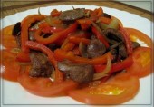Салат из обжаренной куриной печени с луком и сладким перцем. Можно добавить тертую или нарезанную соломкой морковку.