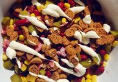 варена ковбаса – 250 г ,консервована кукурудза – 1 банка ,мариновані огірки – 2 шт. ,яйця – 3 шт. ,петрушка – пучок ,майонез – 100 г ,картопля – 4-5 шт.