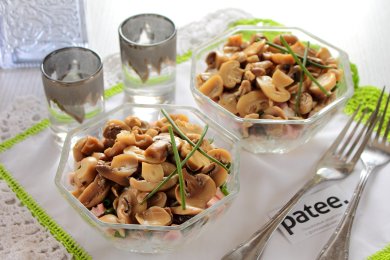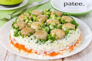 Готовим популярный и вкусный салат Грибная поляна, ведь на праздничном столе он смотрится весьма эффектно благодаря шляпкам маринованных шампиньонов, выглядывающих из слоя зелёного лука, ассоциирующегося с травяным покровом, поэтому создаётся впечатление, что грибы растут как живые:)!