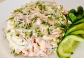 Вкусный, не дорогой, быстрый в приготовлении салат! Очень нежный вкус!
