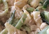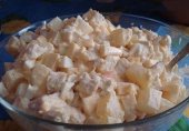 Легкий, вкусный салат с ананасовой свежестью и кислинкой киви. Отварной картофель, сыр и шампиньоны, жареные со сметаной дают сытость.