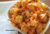 Салат из тертой моркови с консервированным ананасом, изюмом, ананасовым йогуртом и майонезом. Можно подавать с холодной курицей или использовать в сэндвичах.