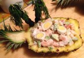 Ананасы прекрасно сочетаются в самых различных блюдах не только с курицей, индейкой или свининой, но и с крабовыми палочками, особенно в салатах.