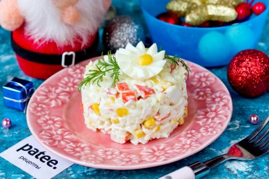 Любимый многими салат с крабовыми палочками - частый гость на новогоднем столе! Сколько же вариантов этого салата существует, на пальцах не пересчитать, наряду с основными ингредиентами салата, которыми являются крабовые палочки, куриные яйца и консервированная кукуруза, хозяйки часто используют пекинскую капусту, свежие или солёные огурцы, яблоко, сухарики, морковь, грибы.