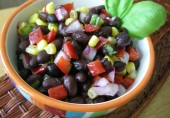 Салат из консервированной фасоли с кукурузой, сладким перцем, чесноком и базиликом, заправленный оливковым маслом с уксусом и специями.