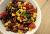 Сальса из консервированной черной фасоли с кукурузой, помидорами и перцем халапеньо, заправленная растительным маслом с уксусом и специями.