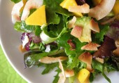Салат из зелени, манго и авокадо, заправленный соком лайма с оливковым маслом и нектаром агавы и посыпанный жареной кокосовой стружкой.