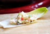 Легкий салат из крабового мяса с сельдереем и изюмом, заправленный йогуртом и майонезом и приправленный специями.