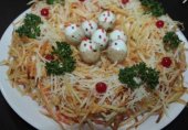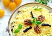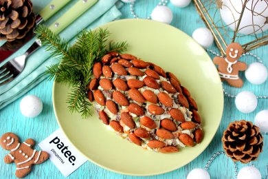 Готовим домашний праздничный мясной салат Шишка с говядиной, грибами и яйцом на новогодний стол! В принципе, под таким украшением можно замаскировать практически любой салат, смешанный или слоёный, с курицей, колбасой или даже рыбой, что уж говорить - даже всеми любимый салат Оливье в виде шишки воспримется по-новому, а миндальные орешки придадут ему необычный вкусовой акцент!