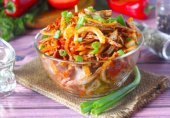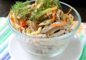 Готовим салат с фунчозой овощами и мясом. Фунчоза (стеклянная лапша) - блюдо азиатских кухонь, которое готовят с добавлением овощей, мяса и грибов, а так же заправляют специально приготовленной заправкой.