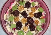 Многослойный салат с отварным мясом, морковью, свеклой, картофелем и черносливом, заправленный майонезом и украшенный черносливом, грецкими орехами и зеленью.